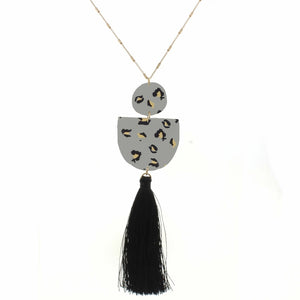 30" Grey Leopard Faux Polymer Circle and Partial Circle with Jet Tassel Pendant Necklace, 3" Ext.